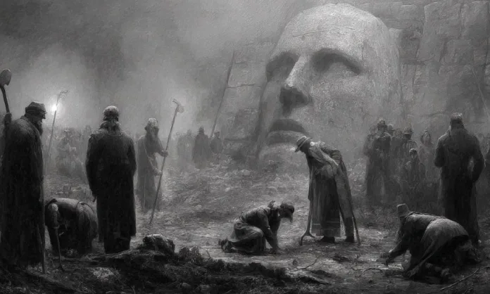 Το πτώμα-γίγαντας είχε όλα τα “σημάδια” του αρχαίου: ρυτίδες, μαρμάρινο βλέμμα, στάση ταφής, χέρια σταυρωμένα στο στήθος. Η υφή του ήταν πορώδης, σαν πέτρα που έμεινε αιώνες θαμμένη. Το έφτιαξαν σε έναν αχυρώνα στην Iowa, νύχτες κρυφές, με σμίλες, καλέμια και τρεις άντρες που ορκίστηκαν σιωπή.
