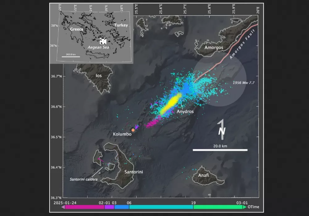 Τις κρυφές διεργασίες που οδήγησαν στην ιδιαίτερα ενεργή σεισμική δραστηριότητα κοντά στη Σαντορίνη την αρχή του 2025, αποκάλυψε διεθνής ομάδα ερευνητών, ανάμεσα τους και Έλληνες. Η μελέτη τους, που δημοσιεύτηκε στο περιοδικό Science, δείχνει ότι η δραστηριότητα προκλήθηκε από μια τεράστια μαγματική διείσδυση – ένα κατακόρυφο στρώμα μάγματος – που διαδόθηκε κατά κύματα σε απόσταση μεγαλύτερη από 20 χιλιόμετρα μέσα στο φλοιό της Γης σε βάθος μεγαλύτερο από 10 χιλιόμετρα κάτω από τον πυθμένα της θάλασσας.