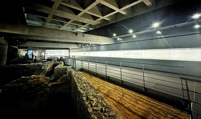 Για να προσεγγίσει ο επισκέπτης την προθήκη των 34 μ. θα πρέπει να φτάσει στο πέρας του ανεσκαμμένου χώρου, στη νότια πλευρά, όπου βρίσκονται τα κατάλοιπα τριών οικιών, οι οποίες χρονολογούνται μεταξύ 4ου και 5ου αι. μ.Χ. Θα περπατήσει πάνω στον μεταλλικό διάτρητο διάδρομο για να δει – όταν θα τοποθετηθούν – τα μικρού κυρίως μεγέθους εκθέματα, που θα του συστήνουν αρχικά τους πρώτους κατοίκους της περιοχής, τη ζωή τους στις παρυφές της πόλης και τη διαδρομή τους ώστε να φτάσουν στη δημιουργία της πόλης-κράτους. Οσο θα προχωρά κατά μήκος της εντυπωσιακής προθήκης – η οποία αποτελεί ειδική κατασκευή και όπως και το σύνολο του εξοπλισμού του Μουσείου της Ανασκαφής υλοποιείται χάρη στη χορηγία άνω του 1 εκατ. ευρώ από την Τράπεζα της Ελλάδος – θα ανακαλύπτει μέσα από τα ευρήματα πληροφορίες για την καθημερινότητα των εύπορων κατοίκων της περιοχής. Πιο συγκεκριμένα τα εκθέματα θα «μιλούν» για την παρουσία των ανδρών στη δημόσια ζωή της πόλης, καθώς και για τις συνήθειες του ιδιωτικού τους βίου μέσω των συμποσίων, τη χειροτεχνική δραστηριότητα των γυναικών, αλλά και το ενδιαφέρον τους για τον καλλωπισμό, το παιχνίδι ως μέσω έκφρασης των παιδιών και της διατροφής μεταξύ άλλων.