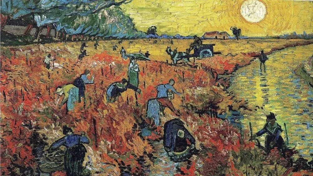 Ο βαν Γκογκ περιέγραψε τη σκηνή στον αδελφό του Τεό ως εξής: «Ένας κόκκινος αμπελώνας, εντελώς κόκκινος σαν κόκκινο κρασί. Στο βάθος γινόταν κίτρινος, και μετά ένας πράσινος ουρανός με έναν ήλιο, χωράφια μοβ και λαμπερά κίτρινα εδώ και εκεί μετά τη βροχή, στα οποία αντανακλούσε ο ήλιος που έδυε».