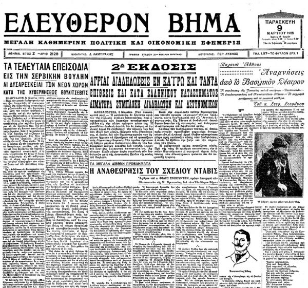 «ΕΛΕΥΘΕΡΟΝ ΒΗΜΑ», 9.3.1928, Ιστορικό Αρχείο «ΤΟ ΒΗΜΑ» & «ΤΑ ΝΕΑ»