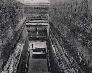 Στις αρχές του 20ού αιώνα, ο Ιταλός αρχαιολόγος Αλεσάντρο Μπαρσάντι ξεκίνησε τις ανασκαφές που αποκάλυψαν έναν τεράστιο λάκκο σε σχήμα Τ, λαξευμένο σε συμπαγή ασβεστόλιθο, βάθους περίπου 30 μέτρων. Το εσωτερικό του επενδύεται με τεράστιους γρανιτένιους ογκόλιθους, ενώ στο κέντρο εντοπίστηκε μια ωοειδής δεξαμενή με γρανιτένιο καπάκι, μέσα στην οποία υπήρχαν –σύμφωνα με τον ίδιο– ίχνη άγνωστης ουσίας που σήμερα έχουν χαθεί.