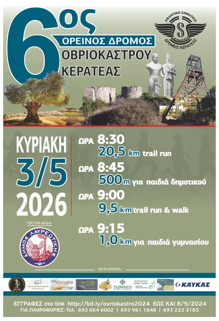 Ο Δήμος Λαυρεωτικής και το αθλητικό σωματείο Δρομείς Κερατέας (S-RUNNERS) σας προσκαλούν την Κυριακή 3 Μαΐου 2026 στον 6ο Ορεινό Δρόμο Οβριοκάστρου Κερατέας, έναν αγώνα που πλέον έχει καθιερωθεί ως ένα από τα πιο ξεχωριστά δρομικά events της Αττικής. Τιμώντας τον αγώνα των 128 ημερών ενάντια στην παράνομη δημιουργία ΧΥΤΑ στον αρχαιολογικό χώρο Οβριοκάστρου, αναδεικνύουμε μέσω του δρομικού κινήματος μία σπάνιας ομορφιάς διαδρομή η οποία βρίσκεται μόλις 30 λεπτά από την Αθήνα.