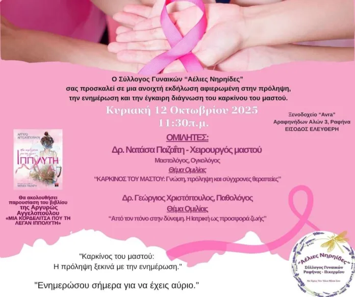Με αφορμή τον Οκτώβριο – μήνα πρόληψης για τον καρκίνο του μαστού, ο Σύλλογος Γυναικών “Αέλιες Νηρηίδες” σας προσκαλεί σε μία ξεχωριστή εκδήλωση ευαισθητοποίησης και ενημέρωσης για τον καρκίνο του μαστού.
