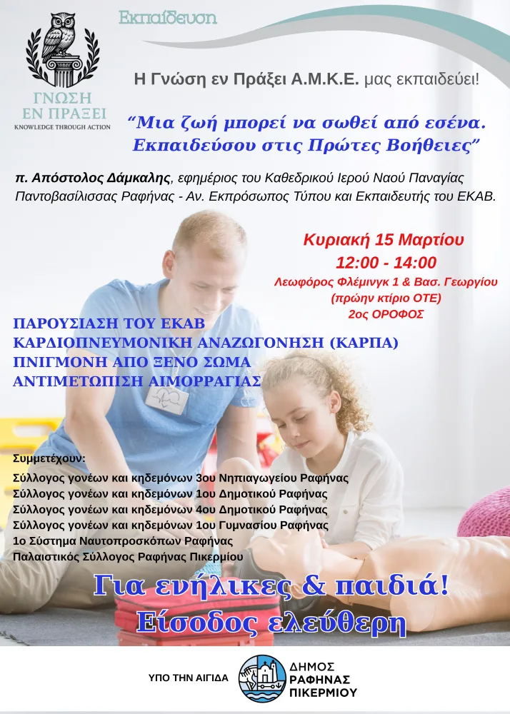 Η «Γνώση εν Πράξει» διοργανώνει σεμινάριο Πρώτων Βοηθειών στη Ραφήνα, την Κυριακή 15 Μαρτίου και ώρα 12:00, στον χώρο της Λεωφόρου Φλέμινγκ 1 & Βασ. Γεωργίου (πρώην κτίριο ΟΤΕ, 2ος όροφος).