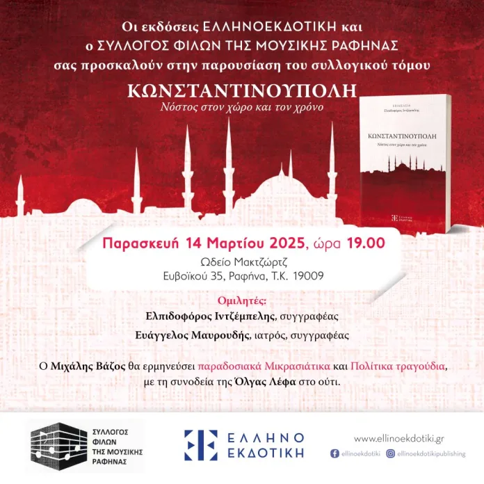 Την Παρασκευή 14 Μαρτίου 2025, ώρα 7 μ.μ., στο Ωδείο Μακτζώρτζ (Ευβοϊκού 35) ο Σύλλογος Φίλων της Μουσικής Ραφήνας παρουσιάζει το βιβλίο «Κωνσταντινούπολη – Νόστος στο χώρο και τον χρόνο» (Ελληνοεκδοτική, 2024). Πρόκειται για συλλογικό τόμο 44 Ελλήνων συγγραφέων, κάποιοι από τους οποίους ανήκουν στην τελευταία γενιά που μεγάλωσε στην Κωνσταντινούπολη. Οι ιστορίες τους συνιστούν πολύτιμες ψηφίδες μνήμης και νοσταλγίας στο ζωντανό μωσαϊκό της Πόλης των πόλεων.