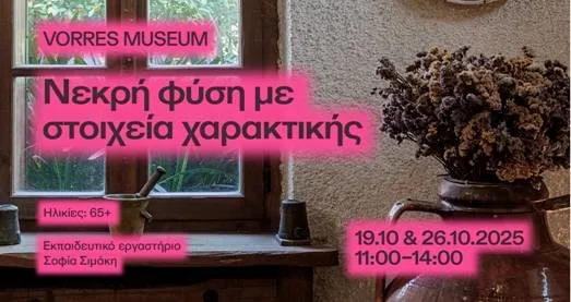 Με μεγάλη χαρά σας προσκαλούμε στα εργαστήρια για άτομα άνω των 65 ετών, τα οποία θα πραγματοποιηθούν από την εικαστικό Σοφία Σιμάκη σε δύο θεματικούς κύκλους: Α΄ κύκλος τις Κυριακές 19 και 26 Οκτωβρίου 2025 και Β΄ κύκλος τις Κυριακές 16 και 23 Νοεμβρίου 2025, στο Μουσείο Βορρέ.