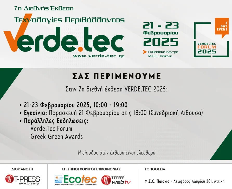 Ο Δήμος Ραφήνας – Πικερμίου συμμετέχει ΔΩΡΕΑΝ, με ξεχωριστό περίπτερο στην 7η Διεθνή Έκθεση Περιβάλλοντος Verde.tec 2025, η οποία θα πραγματοποιηθεί στις 21-23 Φεβρουαρίου 2025 στο MEC Παιανίας.