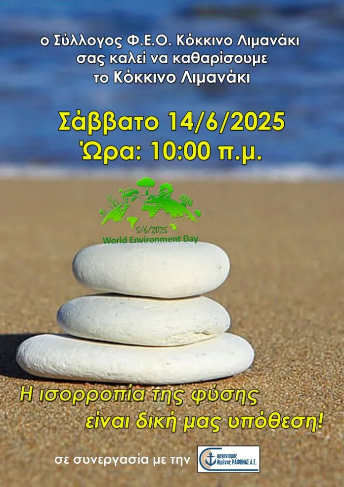 Το Σάββατο 14 Ιουνίου 2025 και ώρα 10:00 π.μ. ο Σύλλογος Φ.Ε.Ο. Κόκκινο Λιμανάκι και η Ο.Λ.Ρ. Α.Ε. οργανώνουν μία στοχευμένη δράση καθαρισμού της παραλίας στο Κόκκινο Λιμανάκι, για την ευαισθητοποίηση των πολιτών και την προστασία του θαλάσσιου περιβάλλοντος, δίνοντας έμφαση στην αξία του εθελοντισμού.