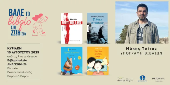 Το βιβλιοπωλείο Αναγέννηση (Πλατεία Εκατονταπυλιανής, Παροικιά), ο Δήμος Πάρου και οι εκδόσεις Μεταίχμιο, προσκαλούν τους μικρούς και μεγάλους φίλους του βιβλίου να συναντήσουν τον συγγραφέα Μάκη Τσίτα, την Κυριακή 10 Αυγούστου 2025, στις 19:00.