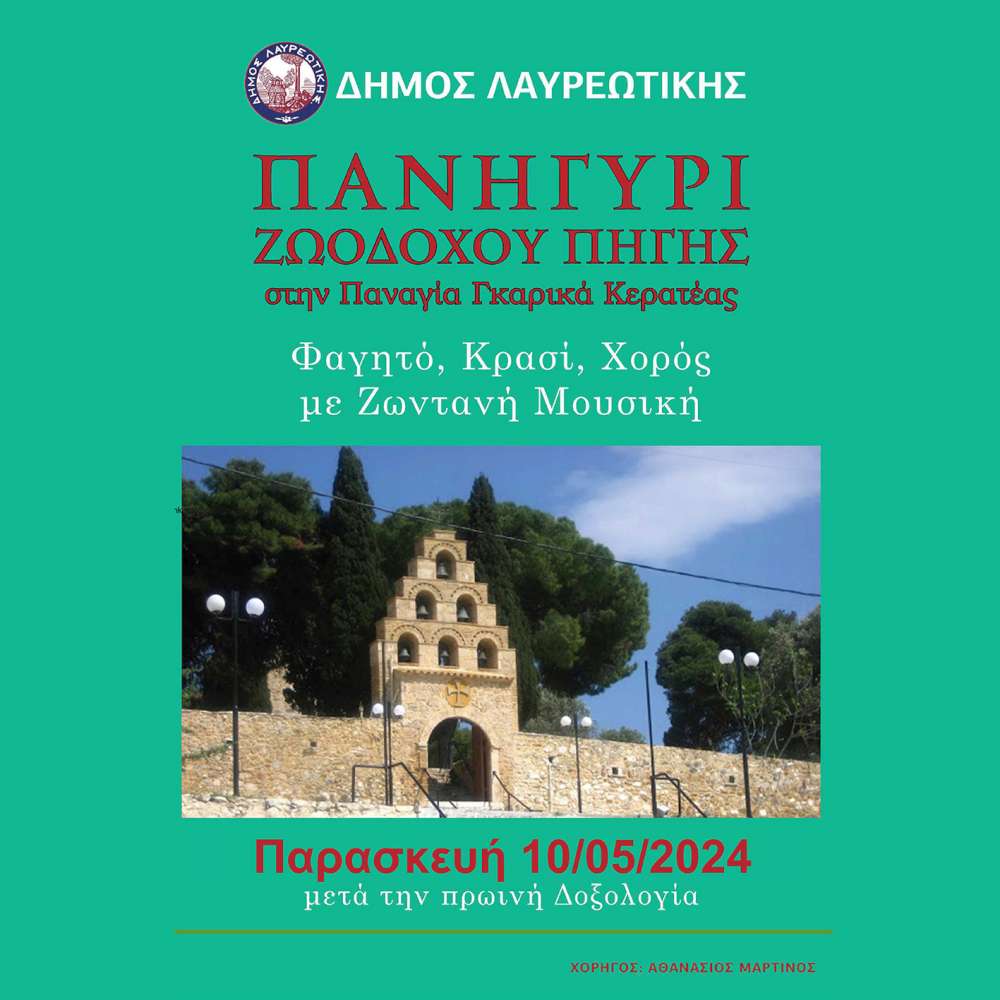 Ο Δήμος Λαυρεωτικής σας προσκαλεί στο παραδοσιακό πανηγύρι της Ζωοδόχου Πηγής, την Παρασκευή 10 Μαΐου 2024 στην Παναγία Γκαρικά Κερατέας μετά την πρωινή δοξολογία. Θα υπάρχει φαγητό, κρασί και χορός με ζωντανή μουσική!