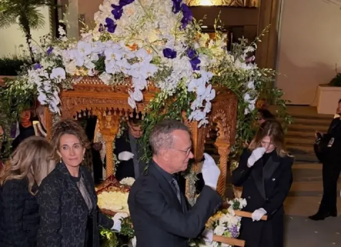 Στις φωτογραφίες που ανέβασε στο Instagram η Μελίνα Κανακαρίδη, η ίδια και ο Τομ Χανς φαίνονται την Μεγάλη Παρασκευή να μεταφέρουν τον Επιτάφιο του Καθεδρικού Ναού της Αγίας Σοφίας στο Λος Άντζελες.