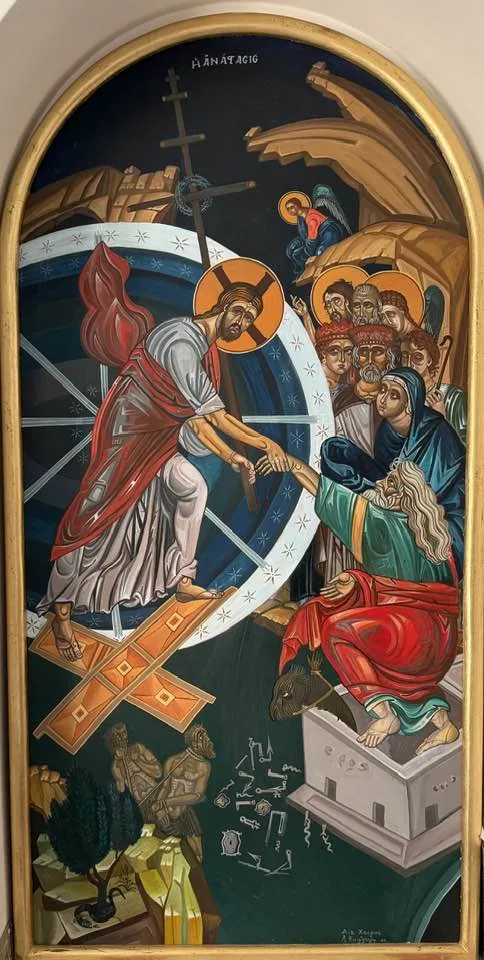 «Ανάσταση» σε κόγχη. Ο Χριστός, κρατώντας τον σταυρό του μαρτυρίου με τον ακάνθινο στέφανο, πατά πάνω στις σπασμένες πύλες του Άδη (διακρίνονται διαλυμένοι οι μεντεσέδες τους) και, έχοντας δέσει πισθάγκωνα τον διάβολο και τον θάνατο, σηκώνει από τον τάφο τον Αδάμ. Δίπλα στον Αδάμ η Εύα και, πίσω της, ο Δαβίδ, ο Σολομών και ο Άβελ. Πιο πίσω ο Ιωάννης ο Πρόδρομος. (Leonidha Bulgari, ακρυλικό, 130Χ50 εκ., 1997