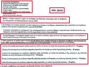 Το έγγραφο που συντάχθηκε στις 28 Μαρτίου 2024 έχει τίτλο «Αίτημα γαλλικών Αρχών για συνδρομή της Ελληνικής Αστυνομίας κατά τη διεξαγωγή των Ολυμπιακών και Παραολυμπιακών Αγώνων 2024» και αφορά, όπως προαναφέρθηκε, την παρουσία στη Γαλλία τουλάχιστον 12 στελεχών της ΕΛ.ΑΣ. Σε αυτό διευκρινίζεται, επίσης, ότι ζητούνται «ένας συνοδός αστυνομικών σκύλων μετά του σκύλου αυτού για την ανίχνευση εκρηκτικών (μονάδα Κ-9) που θα παραμείνει στο Παρίσι 33 ημέρες.