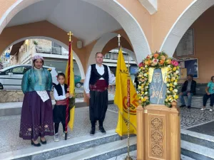 Μέλη του συλλόγου Τριγλιανών με παραδοσιακές Τριγλιανές φορεσιές, κρατώντας σημαίες – σύμβολα εκκλησιαστικής και πολιτισμικής ιστορίας, με περήφανο σημαιοφόρο λιλιπούτειο Τριγλιανό, στέκονταν παραστάτες της στολισμένης με λουλούδια εικόνας του Αγίου Χρυσοστόμου