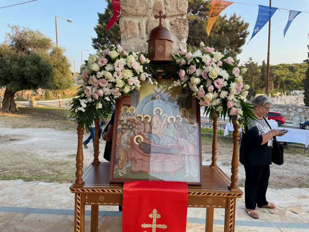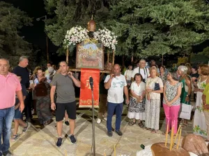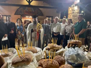 Χτες στο Μεγάλο Εσπερινό, παρά την αφόρητη ζέστη, πλήθος πιστών παρακολούθησε τη λειτουργία με τη λιτάνευση της Εικόνας της Κοιμήσεως, την αρτοκλασία και το κέρασμα που ακολούθησε με λουκούμι κι ένα ποτηράκι τσίπουρο.